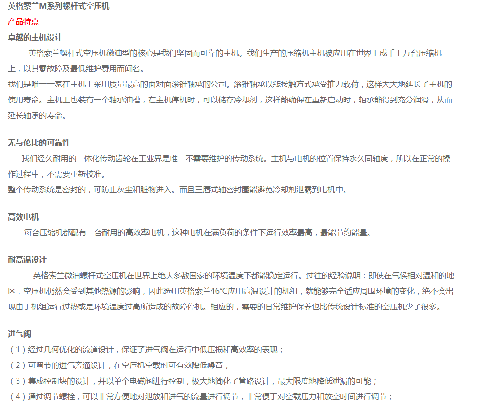 濟(jì)南銳博特機(jī)械設(shè)備有限公司是英格索蘭空氣壓縮機(jī)的授權(quán)代理商,代理銷(xiāo)售美國(guó)英格索蘭全系列的空壓機(jī)及后續(xù)處理設(shè)備。公司自成立以來(lái),經(jīng)過(guò)公司全體同仁不斷努力,開(kāi)拓創(chuàng)新,以?xún)?yōu)良的技術(shù)、完善的售后服務(wù),使得公司贏得了一個(gè)又一個(gè)的誠(chéng)心客戶(hù)。我公司擁有多名專(zhuān)業(yè)的銷(xiāo)售及售后服務(wù)人員,為客戶(hù)提供空壓系統(tǒng)的售前、售中及售后的全方位優(yōu)質(zhì)服務(wù)。另公司有多名具有英格索蘭壓縮機(jī)授權(quán)服務(wù)證書(shū)的服務(wù)工程師,能維修和保養(yǎng)國(guó)內(nèi)外各種品牌空壓機(jī),公司各種國(guó)內(nèi)外品牌空壓機(jī)配件庫(kù)存齊全。